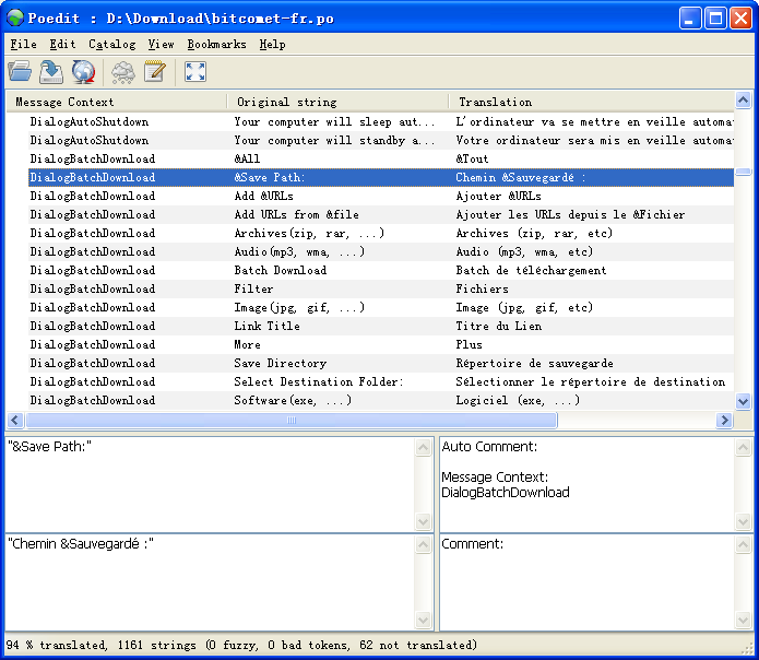 If you want to manually modify the translated text and to replace the translation file you are currently using, please download the corresponding .po file from https://github.com/bitcometdev/translation, then edit it using Poedit (a free software from https://poedit.net/), finally save it as .mo file to the lang sub-folder of the BitComet installation location.